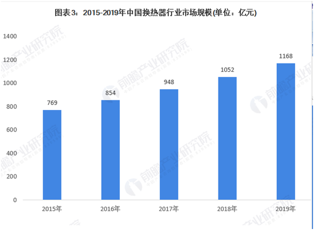 我國換熱器行業(yè)主要集中于石油、化工、冶金、電力、船舶、集中供暖、制冷空調、機械、食品、制藥等領域,應用范圍廣泛,并且當前國家倡導工業(yè)生產節(jié)能、減排、降耗,因此換熱器市場需求較大,市場規(guī)模不斷增長。2019我國換熱器行業(yè)市場規(guī)模約為1168億元。