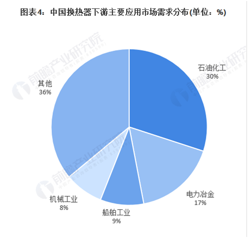 中國換熱器產業(yè)主要集中于石油、化工、冶金、電力、船舶、集中供暖等領域。其中,石油、化工行業(yè)是換熱器最主要的應用領域,約占換熱器30%的市場份額。石油、化工生產中幾乎所有的工藝過程都有加熱、冷卻或冷凝過程,都需要用到換熱器。電力和冶金兩大行業(yè)所需的換熱器約占換熱器市場17%的份額。船舶行業(yè)應用大量的中央冷卻器等換熱設備,約占換熱器行業(yè)9%的市場份額;機械行業(yè)在汽車、工程機械、農業(yè)機械中應用大量的機油冷卻器、中冷器等換熱器,約占換熱器行業(yè)8%的市場份額。此外,在食品、醫(yī)藥等領域,換熱器市場需求也較大。
